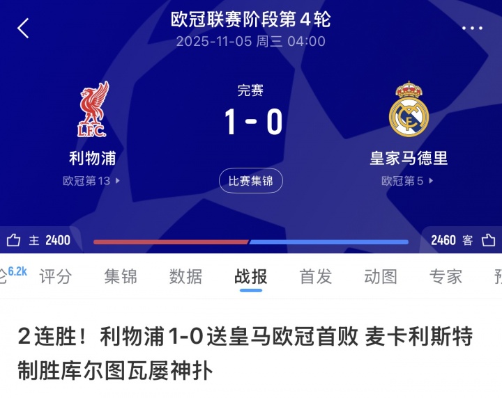 本赛季皇马在欧冠赛场4胜1负,唯一的败仗是11月5日客场0-1利物浦,送给对手欧冠首胜的同时极大了缓解了利物浦主帅斯洛特的战绩压力。